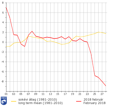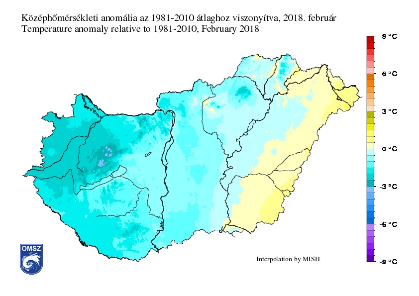 Országos átlagban a havi középhőmérséklet -0,3 °C-nak adódott, mely közel 0,8 °C-kal alacsonyabb, mint az 1981-2010-es normál. A keleti országrész, a Tiszántúl kivételével az ország jelentős hányadán a sokévi átlag alatt alakult a hőmérséklet. A legnagyobb negatív hőmérsékleti eltérést az Észak-Dunántúlon a Magas-Bakony területén és a Bükkben figyeltük meg. Ezeken a tájakon 3-4 fokkal volt hidegebb, mint az 1981-2010-es időszakban.