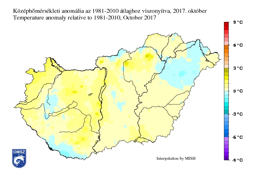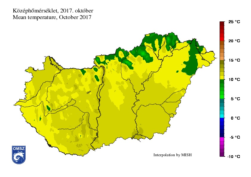 Az 1981-2010-es normálhoz hasonlóan alakult az országos havi középhőmérséklet. Az átlagnál alacsonyabb értékek zömmel a Nyírség, a Dráva-mente és a Balaton-felvidék területein adódtak. Az Északi-középhegység egyes részein, a Mecsekben, valamint a Dunántúli-középhegység körzeteiben fordult elő pozitív irányú eltérés, melynek értéke 1-2°C, azonban előfordultak 2,5°C-ot meghaladó értékek is. A hónap középhőmérséklete országos átlagban 11°C-nak adódott, amely 0,5°C-kal haladta meg a sokévi átlagot.