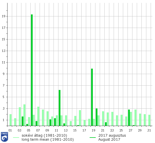 Augusztusban az erőteljes felmelegedéssel és kánikulával járó időszakok teljesen csapadékmentesen teltek. A hónap folyamán négy csapadékos időszak volt, amelyek a hőhullámokat megszakító hidegfrontokhoz kapcsolódtak, és viharokkal, felhőszakadással, illetve jégesővel jártak. Országos átlagban a legtöbb csapadék augusztus 6-án érkezett, a napi átlag több mint tízszerese. Augusztus 10-én Sopron Kuruc-dombon 137 km/óra, másnap Kaposváron 110 km/órát meghaladó szélerősséget mértünk zivataros időjárási helyzetben. Augusztus 12-én egy felhőszakadás Csarodán közel 100 mm csapadékot hozott. Ebben a régióban gyakorlatilag egy nap alatt hullott a teljes havi csapadékmennyiség. Ezen kívül augusztus 19-20-án, illetve 27-én rögzítettünk a napi átlagnál több esőt. Összességében a csapadékos napok száma elmaradt az 1981-2010-es átlagtól. A legtöbb csapadékos nap (9 nap) Sopron térségében volt. Országszerte 19 mérőállomásunkon hullott legalább 1 nap 50 mm-t meghaladó csapadék, és ugyanennyi mérőállomás számolt be jégeső előfordulásáról. A legtöbb zivataros napot (8 nap) Bátorliget és Peresznye állomáson jegyeztük.