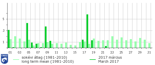 A hónap eleji csapadékhullás egy hullámzó frontrendszerhez köthető, amely eső, zápor formájában hullott. Ezt követően szárazabb időszak következett, melyet egy hidegfront átvonulás szakított meg. Ehhez az időszakhoz köthető a legnagyobb 24 órás csapadékösszeg, 30,2 mm, melyet Gerecse-tető állomásunkon mértünk, március 18-án. A hónap második felében leginkább anticiklonális hatások érvényesültek, így meglehetősen szárazan alakult a hónap hátralévő része.