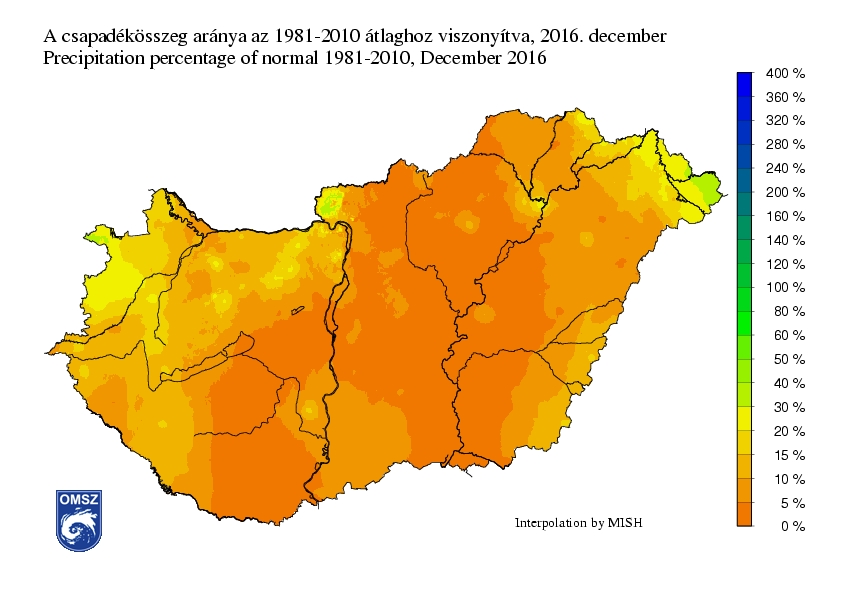 A decemberi átlagos csapadékmennyiség az 1981-2010-es sokévi átlag mindössze 8 %-a, így az egész országban jelentős csapadékhiány mutatható ki a sokévi átlaghoz viszonyítva. A legcsapadékosabb tájakon (Felső-Tisza vidék, Börzsöny, Soproni-hegység) a normálérték alig 30-40 %-a hullott le, míg az Alföld középső területein és a Dél-Dunántúlon alig 5 %-a.
