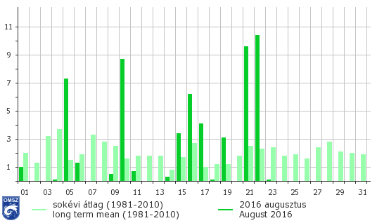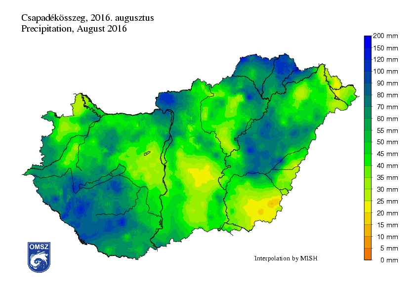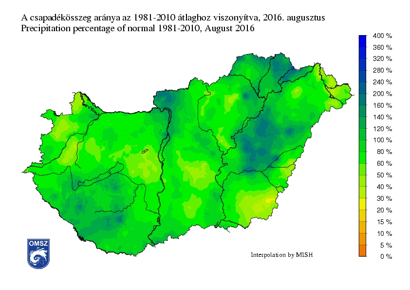 Augusztusban a lehullott csapadékmennyiség elmaradt a 1981-2010 sokéves átlagtól az Észak-Dunántúlon, a Kiskunságban és a Körös-Maros-közben, ahol a szokásos mennyiségnek csupán a fele hullott. Főként a Zemplénben, Aggtelek térségében és a Börzsönyben, a Hortobágyon, illetve a Belső-Somogy területén volt az éghajlati normálnál több csapadék. Ezeken a tájakon az ilyenkor szokásos csapadékmennyiség dupláját összegeztük.