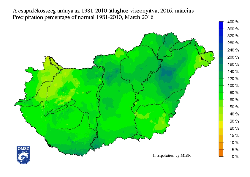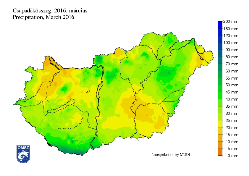 Az ország nagy részén 20-40 mm közötti havi csapadékösszeget jegyeztünk. A Dunántúl északi és az ország délkeleti részén, valamint a Szatmári-síkság területén ennél alacsonyabb, 5-15 mm közötti értékeket mértünk. A Villányi-hegységtől délre, valamint Debrecen környékén fordultak elő nagyobb havi csapadékösszegek. A legnagyobb havi összeget Drávaszabolcs állomáson (71,3 mm), a legkisebb havi értéket pedig Rajkán (10 mm) regisztráltuk.