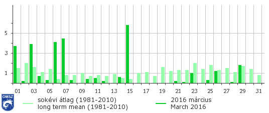 Március elején több mediterrán ciklon vonult át hazánk felett, és ezeknek köszönhetően csapadékosan indult a hónap. Március közepén a már említett magassági hidegcsepp okozott jelentős csapadékhullást az országban, hó, havas eső és esőformájában. Ezt egy csapadékmentes időszak követte, melyet március 23-án egy észak felől érkező hidegfront szakított meg. A hónap vége azonban már ismét csapadékmentesnek bizonyult.