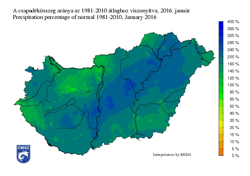 2016 januárjában a megszokotthoz képest a legnagyobb csapadéktöbblet egy az országot délnyugat-északkelet irányban átszelő sávban hullott. Itt az 1981-2010-es normálértéknek 200-240%-át, kisebb területeken 240-280%-át figyelhettük meg. A Dunakanyarnál és a Bakony egyes részein a szokásos csapadékmennyiségnek általában 100-120%-át regisztráltuk, de kisebb foltokban előfordult, hogy a csapadék mennyisége nem érte el a 100%-ot.