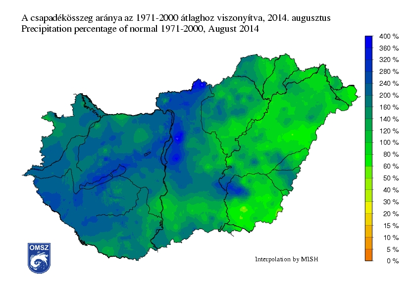 Országos átlagban augusztus utolsó napja bizonyult a legcsapadékosabbnak. A megszokottnál csapadékosabb volt még a 3-a és 9-e közötti időszak is. A hónap során mindössze öt napon nem hullott mérhető mennyiségű csapadék országos átlagban.