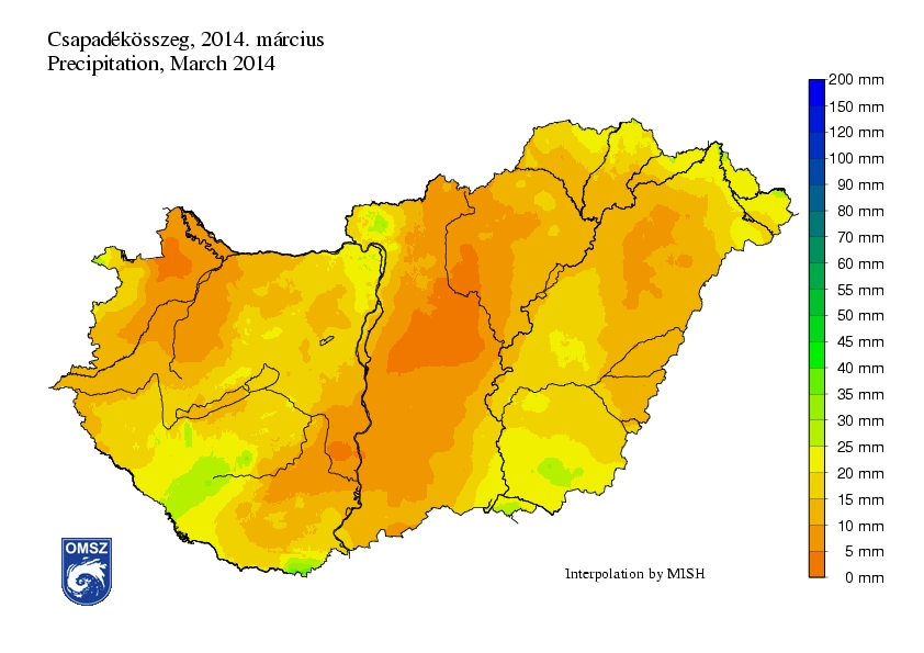 Jellemzően a megszokott csapadékmennyiség 40-50%-a hullott le hazánkban március folyamán. A Kisalföld térségében és a Duna-Tisza-közén jelentős csapadékhiányról számolhatunk be (a normál 10-30%-át jegyeztük). Csak délkeleten közelítette meg a havi csapadékmennyiség az 1971-2000-es éghajlati normál értékeit (80-100%). A márciusi országos átlagos csapadékösszeg 14,4 mm-nek adódott, mely a sokéves átlag mindössze 45%-ának felel meg.