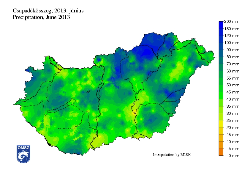 2013 májusának utolsó és júniusának első napjaiban rövid idő alatt nagy mennyiségű csapadék hullott le a Duna felső vízgyűjtőjében, elsősorban Győr és Linz között, mely a Duna megáradásához vezetett. A 2013-as dunai árvízről bővebben olvashatnak honlapunk tanulmányai között (cím: „A 2013. júniusi dunai árvíz időjárási háttere”). Hazánkban országos átlagban a legtöbb csapadék június 24-én esett: a másik két kiemelkedő érték 10-én és 22-én meg sem közelíti a 24-i mennyiséget. A hónap legmagasabb napi csapadékösszege is 24-éhez kötődik: Szikszó állomásunkról 75 mm csapadékot jelentettek ezen a napon. 7 napon jegyeztünk normált meghaladó napi csapadékösszeget, a hónap közepén pedig 6 napon keresztül nem hullott számottevő csapadék országos átlagban.