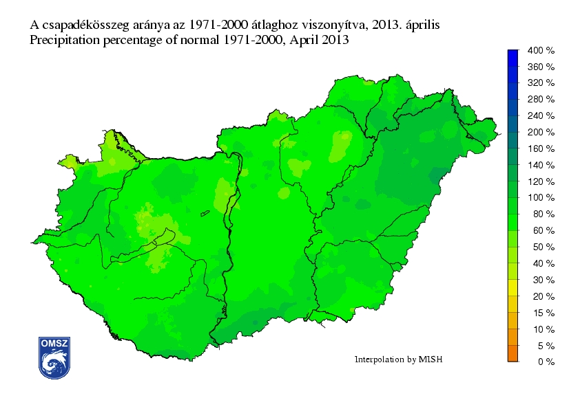 Az április havi csapadékösszeg az ország legnagyobb részén nem érte el a sokéves átlagot, jellemzően annak 60-100%-a hullott. Csak kis területeken jelentkezett ennél kisebb arány, a legcsapadékosabb ÉK-i és D-i országrészeken pedig meghaladta a normál értéket a csapadék mennyisége (100-120%, néhol 120-140%).