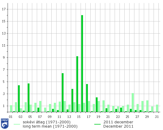Meghatározó mennyiségű csapadék országos átlagban 8 napon hullott, ezek közül 3 alkalommal 5 mm fölötti összeg. A legtöbb csapadék - országos viszonylatban mintegy 16 mm - 16-án hullott. Ezen a napon Parád Óhuta állomásunkon 40 mm-es összeget mértünk, mellyel megdőlt a napi csapadékrekord. Országos átlagban három napon havazott, ami feltehetően a szokásosnál melegebb időjárás hatására 2-vel maradt el a sokéves átlagtól.