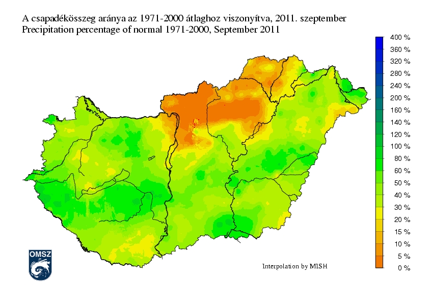 A fenti térkép zöldes, narancsos színei is arra utalnak, hogy az idei szeptember rendkívül száraznak számított. A csapadékban szegény északi országrészben a sokéves havi csapadékhozamnak kevesebb mint 5%-a hullott le, de az ország területén regisztrált összegek jellemzően nem érték el a szokásos mennyiség felét sem. Kivételt ez alól csak a bőségesebb csapadékú térségek jelentettek, de az értékek itt is átlag alattiak voltak.