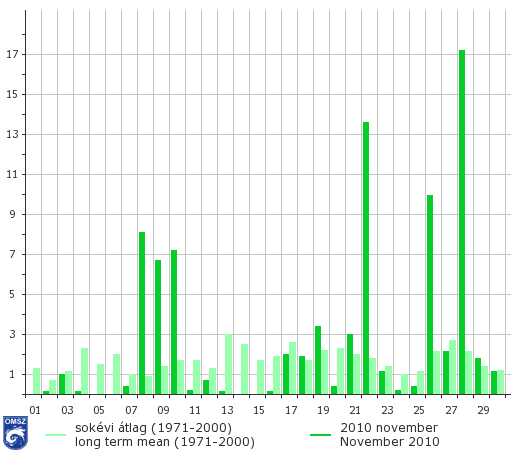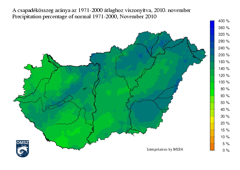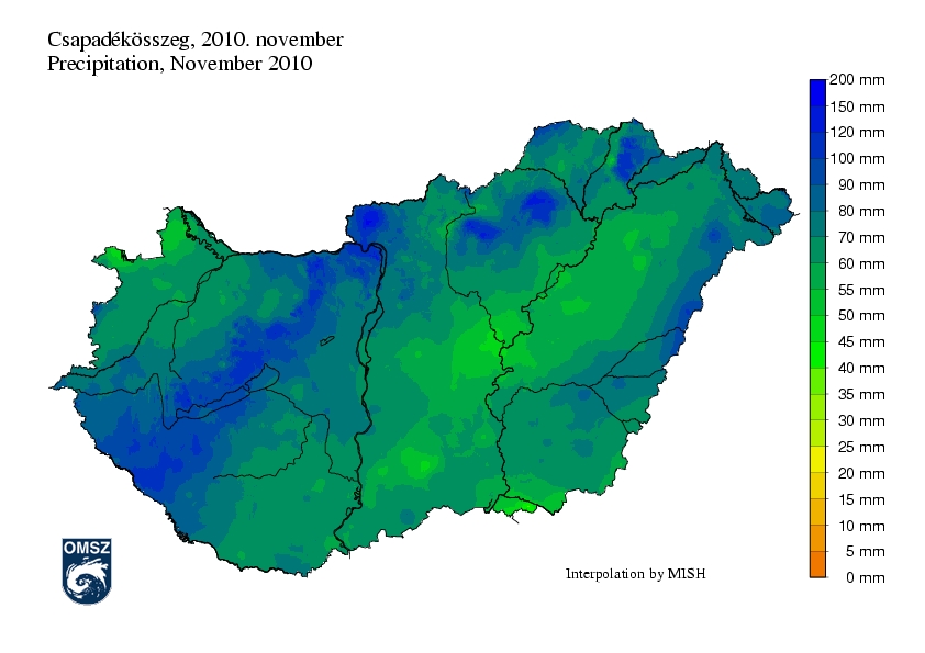 A novemberi csapadékösszeg az ország túlnyomó részén átlagosnak bizonyult. A szokásosnál szárazabb terület csak a Dunántúl déli részén jelent meg, de a sokéves átlagos novemberi csapadékhozam legalább 80%-a itt is lehullott. Az átlagnál nedvesebb az ország keleti fele volt, ebben a régióban másfélszeres, kis területen kétszeres összegek jelentkeztek.
