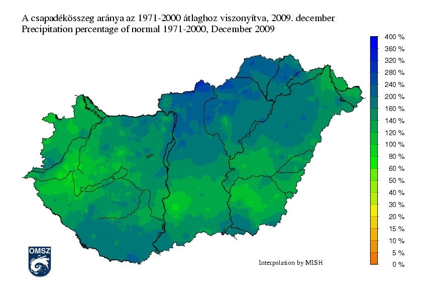 Szinte az egész ország területén átlag feletti havi csapadékösszeg volt jellemző. Csupán a Zala-folyó térsége és a Kalocsai-Sárköz volt szárazabb az átlagnál, ezeken a területeken a sokévi átlagnak megközelítőleg 80%-a hullott. Míg az Alföldön és a Dunántúl észak-nyugati felében 20-40%-ot ért el az anomália, az Északi középhegységben a vártnál kétszer, sőt az északi határ mentén, egy kis területen háromszor magasabb értékek is előfordultak. Jelentős pozitív eltérések rajzolódtak ki a Dunántúl déli részén is (a szokásos 170-200%-a), a maximum a Villányi-hegység környékén meghaladta az átlag kétszeresét.