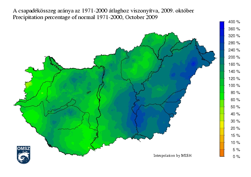 Csapadék tekintetében a területi eltérések jelentősek voltak. A csapadékos időjárásnak köszönhetően az ország jelentős részén pozitív anomália adódott. Átlagtól kevesebb csapadék (60-80 %-a a sokévi átlagnak) a fentiekben említett helyeken fordult elő.