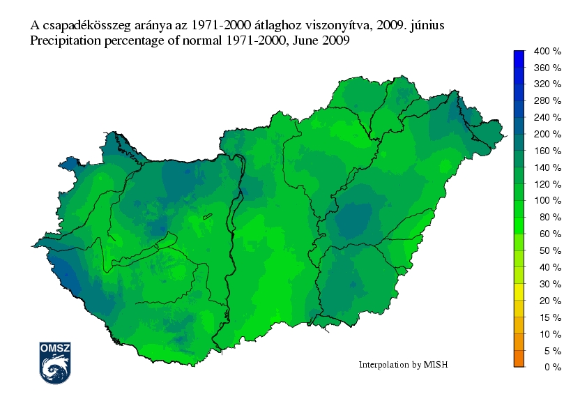 Csapadék tekintetében a területi eltérések jelentősek voltak. Az ország jelentős részén a sokévi átlagnak megfelelő, illetve azt meghaladó mennyiségű csapadékot mértek. Átlagtól kevesebb csapadékot, főként az ország középső részén regisztráltak. Az Északi-középhegységben, Dunántúli-középhegységben, a Dunántúl délnyugati részén, és a Tiszántúlon is voltak olyan területek, ahol a sokévi csapadék 1,5-2-szerese hullott júniusban.