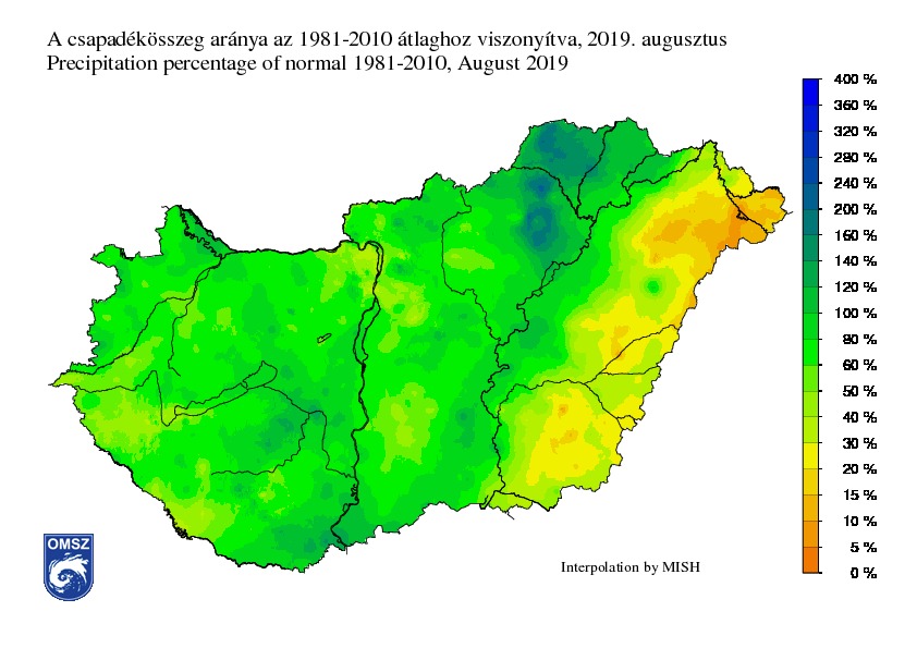 Augusztusban a lehulló csapadékmennyiség az ország nagy hányadán az 1981-2010 közötti normálérték közelében maradt. A Tiszántúl nagy részén, Hajdú-Bihar és Békés megye keleti tájain a sokévi átlag alig 30%-a érkezett, míg a Felső-Tisza vidéken a legkevesebb (a sokévi átlag 5-10%-a). Ezzel szemben egy nagyjából északkelet-délnyugat irányú, a Csereháttól a Dél-Dunántúlig tartó tengely mentén hullott a sokévi átlagnál több csapadék (120-140%). Kiemelkedően sok csapadék ebben a hónapban koncentráltan a Bükk térségében (160-200%) érkezett.