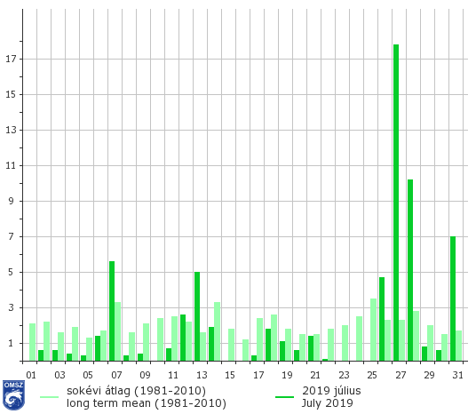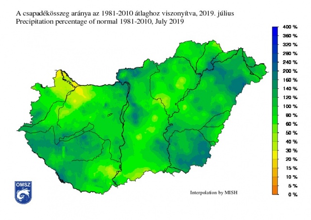 Az 1981-2010-es sokévi átlaggal összevetve látható, hogy a lehulló csapadék Pest és Nógrád megyében, illetve a Tiszántúlon Tokajnál, a Nyírség középső és délkeleti részén, továbbá Békés megyében volt a legtöbb. Ezeken a tájakon helyenként a sokévi átlag 160-200%-a hullott le júliusban. Ezzel szemben Győr-Moson-Sopron megyében az 1981-2010-es érték alig 30%-a érkezett.