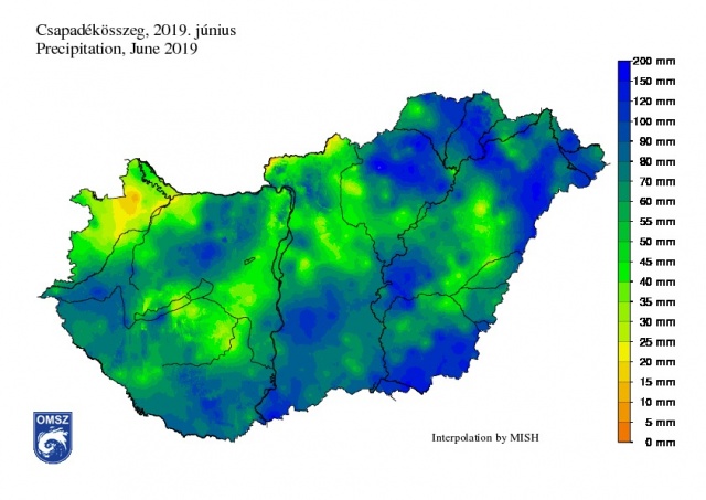 2019 júniusa a legmelegebb volt 1901 óta. Országosan közel átlagos mennyiségű csapadék érkezett, azonban több helyen a felhőszakadások és a viharok jelentős károkat okoztak.
