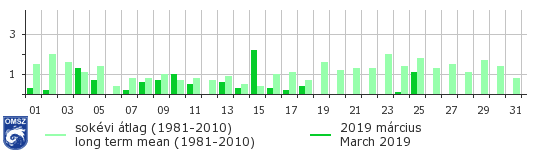 A március havi csapadékösszeg országos átlagban a 10 mm-t sem érte el. Az Alföld tágabb környezete és az északkeleti országrész volt a legszárazabb, ezeken a területeken 5 mm alatti összegeket jegyeztünk. Az ország délnyugati részén, valamint a Börzsöny területén jelentkezett a legnagyobb csapadékösszeg, 30-35 mm körüli csapadékösszegeket mértünk.