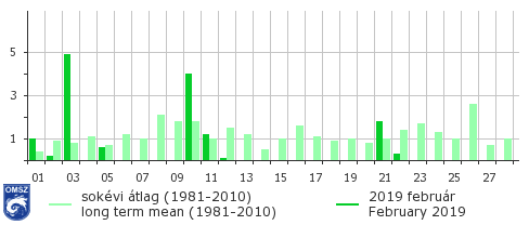 A február igen csapadékszegény volt: országos átlagban mindössze 13 mm csapadék érkezett, mely messze elmaradt az 1981-2010-es sokévi átlagtól. A legtöbb csapadék a Dunántúlon Zala és Baranya megyében hullott, mely 30 mm feletti összegeket jelentett. Ugyanakkor az ország szinte teljes egészén a havi összeg 15 mm alatt marad. A legkevesebb csapadékot Heves megyében összegeztük, itt egy-egy állomáson a havi összeg nem érte el az 5 mm-t sem.