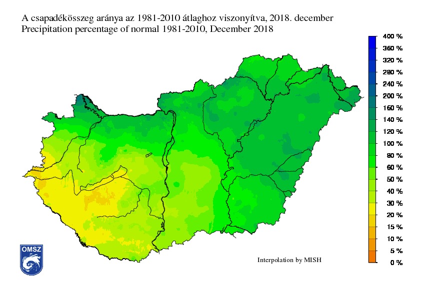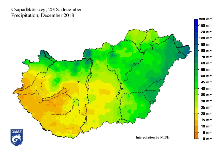 Decemberben a csapadékmennyiség az ország jelentős hányadán az 1981-2010-es sokévi átlag közelében alakult. Míg a legcsapadékosabb tájakon 20-40%-kal több csapadék hullott mint a sokévi átlag, addig Vas, Zala és Somogy megyében a szokásos mennyiségnek csupán 20-30%-a érkezett.