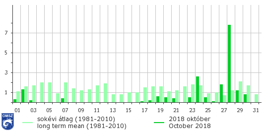 Az októberi csapadékösszeg meglehetősen elmaradt az ilyenkor szokásostól. Országos átlagban mintegy 17 mm csapadék hullott, ami a sokéves átlag csupán 41%-át teszi ki. A legszárazabb területek a déli és a délkeleti országrészben voltak. Egyes helyeken a havi csapadékösszeg az 5 mm-t sem érte el. A legnagyobb havi csapadékösszeg a Bükk területén jelentkezett, Szentlélek állomáson 50,8 mm-t mértek. A legkisebb havi csapadékösszeg pedig Csanádpalotán volt, 3,5 mm-rel.
