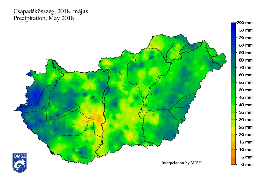 A májusi csapadékmennyiség térbeli eloszlása változatos képet mutat. A legtöbb csapadékot az Alpokalján jegyeztünk, a csapadékmennyiség értéke meghaladta a 120 mm-t is. A legkisebb csapadékösszeg a Solti-síkság területén és foltokban a Börzsöny környékén jelentkezett. Ezeken a területeken mindössze 10-15 mm-t regisztráltunk. A havi csapadékmennyiség országos átlagban 50,3 mm adódott, ami a sokévi átlag mintegy 81%-a.