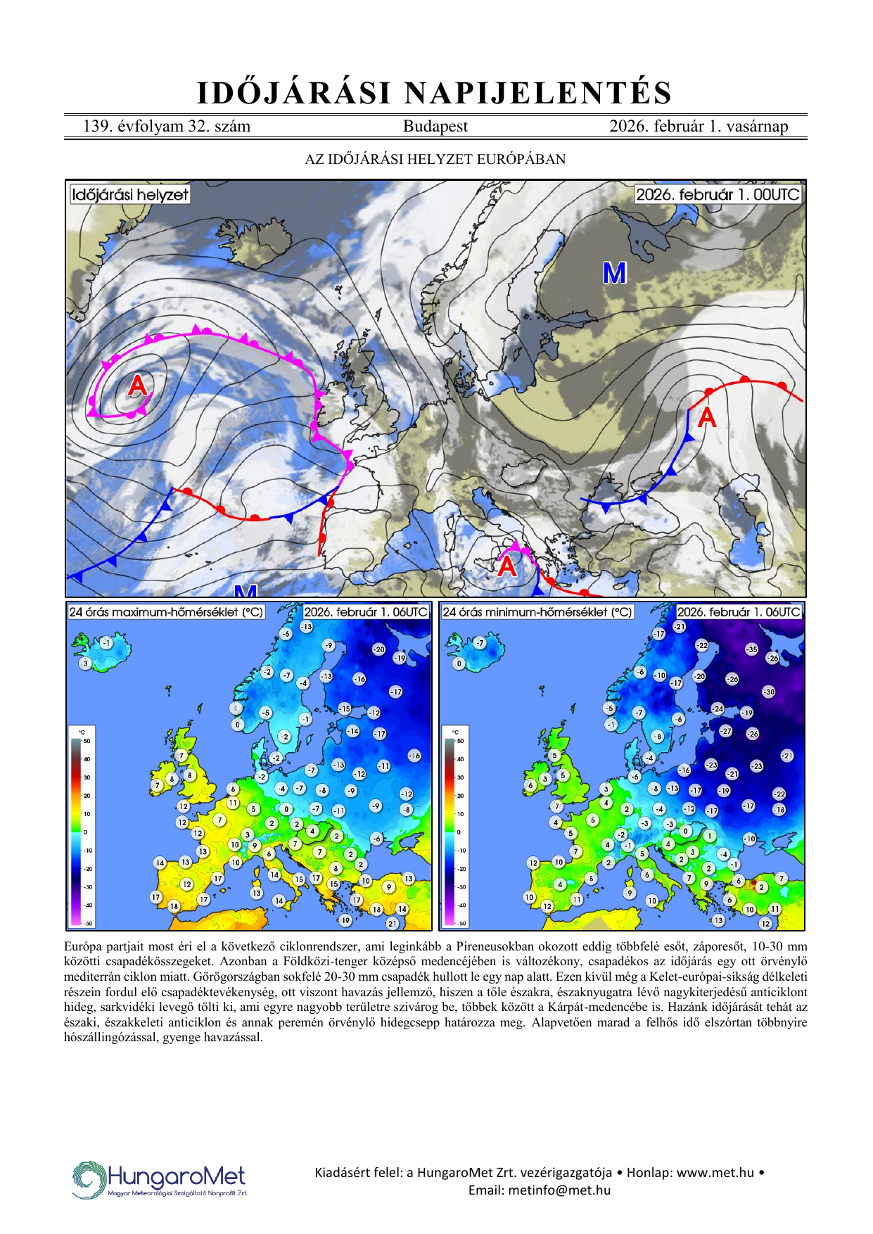 Az európai kitekintés a fronttérkép és a rövid szöveges elemzés mellett bővül a hőmérséklet napi minimum- és maximumértékeit ábrázoló térképekkel.