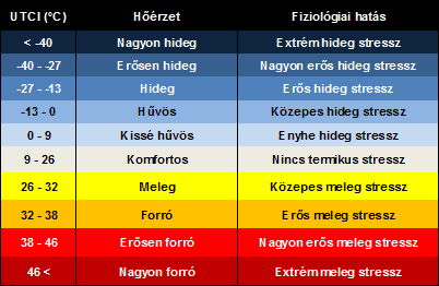 csak a referencia környezet más. További különbség, hogy az UTCI számítása közben testünk energiaviszonyait egy rendkívül összetett fiziológiai modell