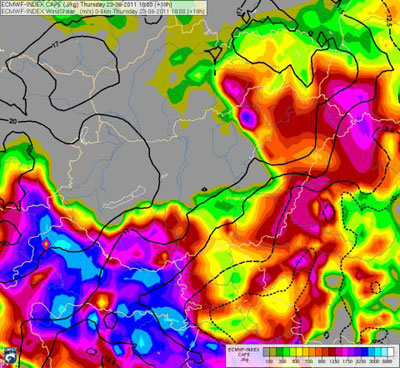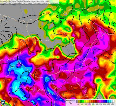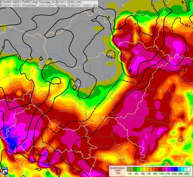 Az északkeleti térségben a fenti kedvező feltételek mellett már megfelelő labilitás (CAPE> 1000 J/kg) és szélnyírás (0-6 km-es szélnyírás > 15 m/s)