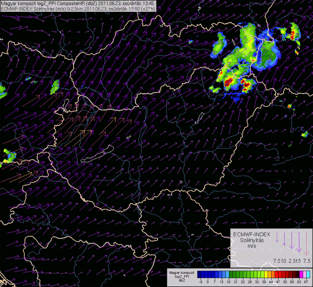 szupercellás zivataroknak már kedvező általában 15-17,5 m/s-os értéket vette fel a délnyugat felől tovább erősödő középszinti szeleknek köszönhetően.