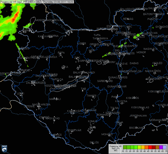 elhaltak, majd később maga a hidegfront vágta alá hideg levegőjével. A pogányvári 120-kmes méréshatárú nagyfelbontású radarkép animáción itt is jól