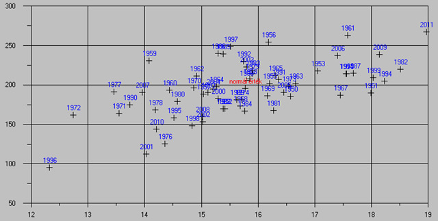 A szeptemberi hőmérséklet-napfénytartam diagram 1951-től napjainkig. A vízszintes tengelyen a