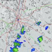 A budapesti 30 km-es kivágatú radarképeken jól látszik a belvárosban keletkezett tűz. |