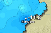 Az előzetes adatok alapján április 2-án ismét megdőlt a napi hidegrekord. Nyírlugoson -11,3 fokig süllyedt a hőmérséklet, így több mint két fokkal megdölt a -8,6 fokos érték, amelyet 2005-ben mértek Zabar állomáson. A következő napra (április 3.) vonatkozó országos legalacsonyabb minimum-hőmérséklet rekordja – 1963 Kékestető, -7,6 fok – is megdőlhet még, majd az éjszakai fagyok jelentősen gyengülnek. |