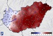 Az ország legnagyobb részén reggel a tegnapihoz képest átlagban jó 10 fokkal volt melegebb. Az előzetes, nem hivatalos adatok alapján november 13-án Csengeren van esély a legmagasabb minimumhőmérséklet rekordjának megdőlésére is: az 1996-os győri 16 fok után 16,7 fok lehet az új csúcs. A rekord csak az adatok teljeskörű ellenőrzése, szűrése után válik hivatalossá, amennyiben este 19 óráig (18 UTC) nem mérünk ennél alacsonyabb hőmérsékletet. |