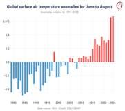 2024 nyarán mérték globálisan a legmagasabb átlaghőmérsékletet a feljegyzések kezdete óta, 0,69 Celsius fokkal volt több az 1991–2020-as normálnál, és ezzel felülmúlta a korábbi 0,66 Celsius fokos rekordot, ami 2023 nyarán született. 2024 augusztusa világviszonylatban a legmelegebb augusztus volt holtversenyben a 2023-assal. 16,82 Celsius fokos középhőmérsékletével 0,71 fokkal haladta meg az 1991–2020-as augusztusi átlagot, és 1,51 fokkal volt magasabb az iparosodás előtti szintnél. |