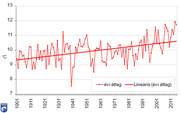A 2015-ös év 11.72 °C-os középhőmérsékleti értékkel 1901 óta a harmadik legmelegebbnek bizonyult, s 0.2 °C-kal maradt el az eddigi legmelegebb 2014-es évtől. Érdekesség, hogy ezúttal több alkalommal, hosszantartó hőségriadók léptek érvénybe, amelyek a nyári időszak aszályhelyzeteit súlyosbították. A 2015-ös év csapadékhullás szempontjából átlagosnak tekinthető az 1901-től induló adatsorban. Az elmúlt évekhez hasonlóan a nyár jelentős része száraznak bizonyult, azonban kivételt képez ez alól az augusztusban lehullott nagymennyiségű csapadék. Az éves átlagos csapadékösszeg 538.9 mm, mely a sokéves átlag 92%-a. Részletes elemzés olvasható az Éghajlati visszatekintőben. |