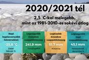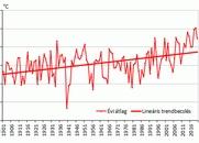 Magyarországon a 2020-as évi középhőmérséklet országos átlagban 11,5 Celsius foknak adódott, így 1,1 fokkal volt melegebb az 1981–2010-es éghajlati normálnál. 2020 a nyolcadik legmelegebb az elmúlt 120 évben, s a legmelegebb évtizedet zárja 1901 óta. Az évi középhőmérséklet országos átlagának változása az elmúlt 120 év alatt (1901 és 2020 között) átlagosan +1,23 Celsius foknak adódott, míg az országon belül legalább +1,06 °C és legfeljebb +1,37 °C közötti hőmérséklet-változás fordult elő. Az év során lehulló csapadék mennyisége országos átlagban 615 mm volt, ami csak két százalékkal több, mint a sokévi érték (1981–2010), viszont mind térben, mind időben igen szélsőségesen alakult az eloszlása. Részletes elemzés olvasható az Éghajlati visszatekintőben. |
