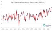 2019 középhőmérséklete országos átlagban 12,19 °C volt, ez a legmagasabb érték 1901 óta az OMSZ éghajlati adatbázisán alapuló homogenizált, ellenőrzött, interpolált adatok szerint. Az 1981–2010-es normál értéket 1,87 fokkal múlja felül. 2018 után ismét megdőlt az éves átlaghőmérséklet rekordja, ugyanis 2018 volt az eddigi csúcstartó. Az első 10 legmelegebb év közül nyolc az ezredforduló utáni évek közül kerül ki. A múlt század elejétől a melegedés mértéke 1,3 fok; a globális melegedés mértékét ez némileg meghaladja. |