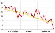 Mindhárom őszi hónap melegebb volt a szokásosnál, és ezzel a 2. legmelegebb őszt tudhattuk magunk mögött 1901 óta. A szeptember mintegy 1,5 °C fokkal, az október 2,4 fokkal, a november pedig 2 fokkal múlta felül az 1981–2010-es átlagot. Csapadék tekintetében az évszak szárazabb volt az átlagnál. A hónapokat tekintve a szeptember átlag körülinek, míg az október és a november szárazabbnak bizonyult az ilyenkor megszokottnál. Az előbbi esetében a normál 41%-a, míg az utóbbi esetében az 1981–2010-es sokévi átlag 84%-a adódott. Összességében országosan 22%-kal hullott kevesebb csapadék a szokásosnál az ősz során. További (tér)képes részletek az Éghajlati visszatekintőben találhatók. |