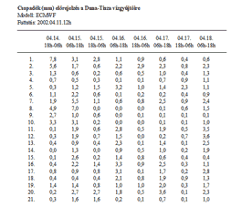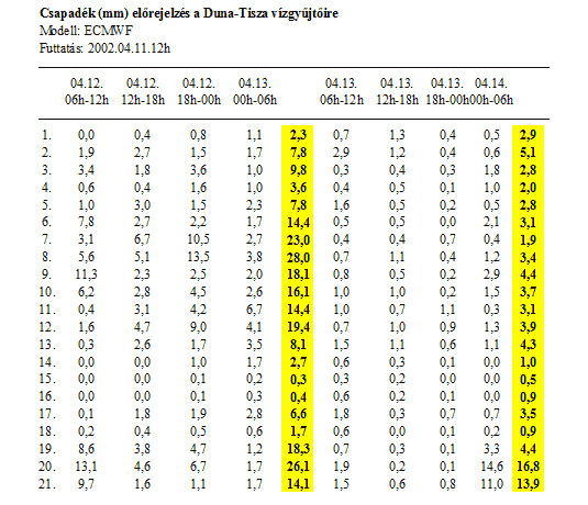 - 10 napra előre 48 óráig hat, ezután tizenkét órás bontásban a várható csapadék mennyiségét területi átlagban (1-2. táblázat)