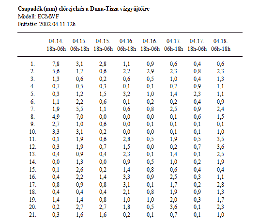 I-4. Táblázat A 21 részvízgyűjtőre szóló ECMWF előrejelzések | |