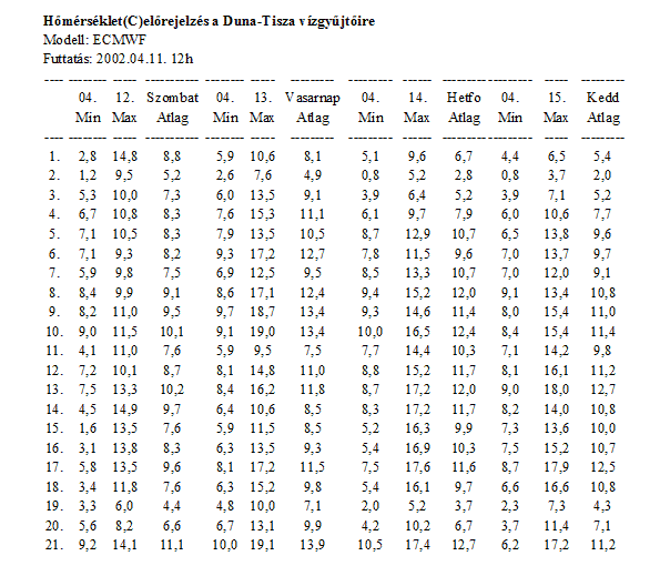 igényel tizedre pontos értéket, mint pl. egy hőszolgáltató. Középhőmérséklet, minimum és maximum hőmérséklet-előrejelzés készül, minden vízgyűjtőhöz