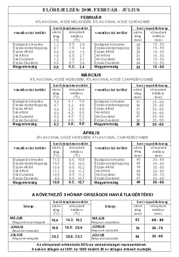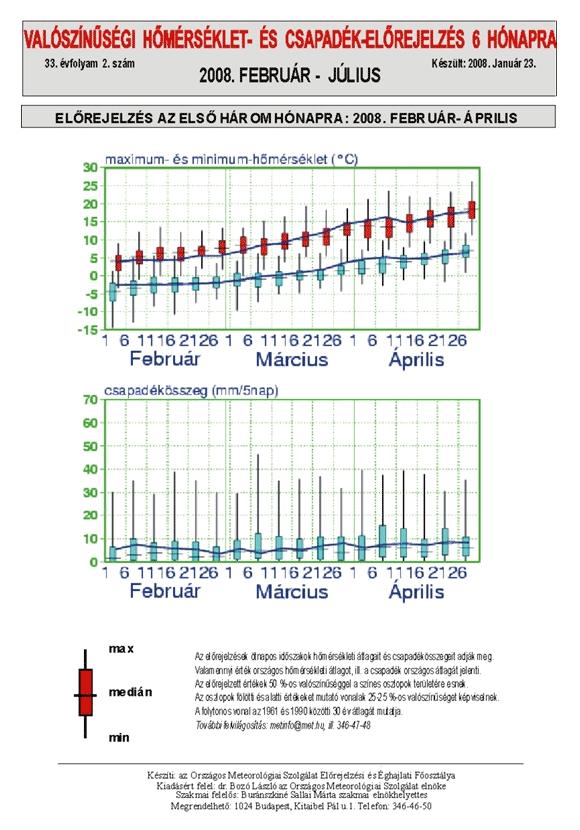 előrejelzés című kiadványban az első három hónapra pentádonként adjuk meg a maximum-, a minimum-hőmérséklet és a csapadékmennyiség várható országos