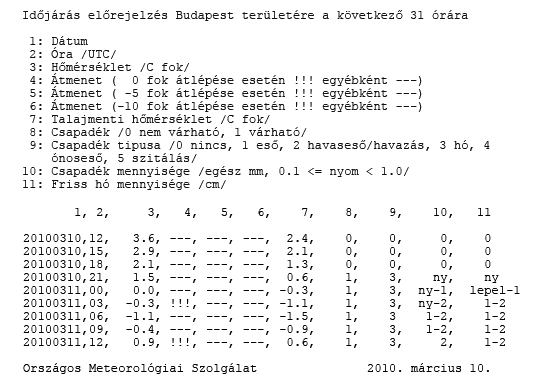 illetve önálló szövegek megfogalmazása (országos, regionális és Budapestre vonatkozó előrejelzések egy, valamint több napra előre, az aktuális időjárási
